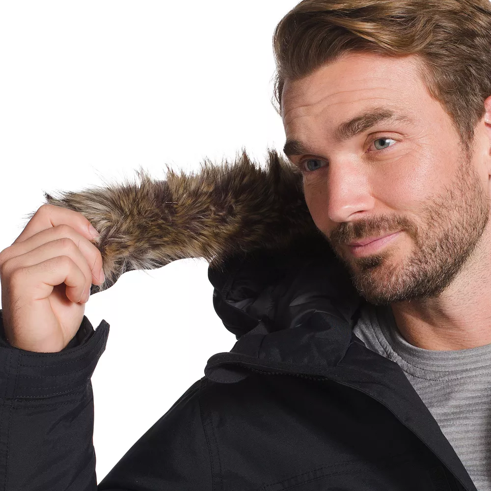 - Attached adjustable hood with faux-fur trim