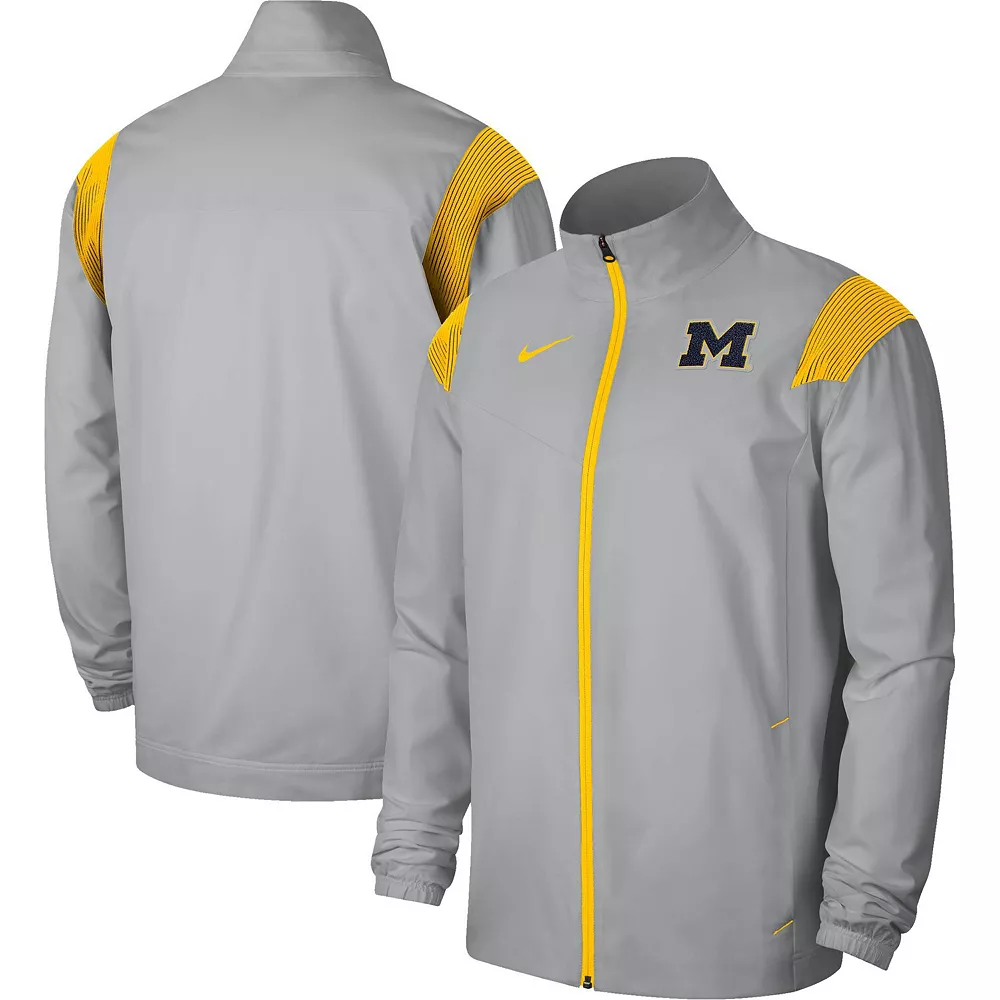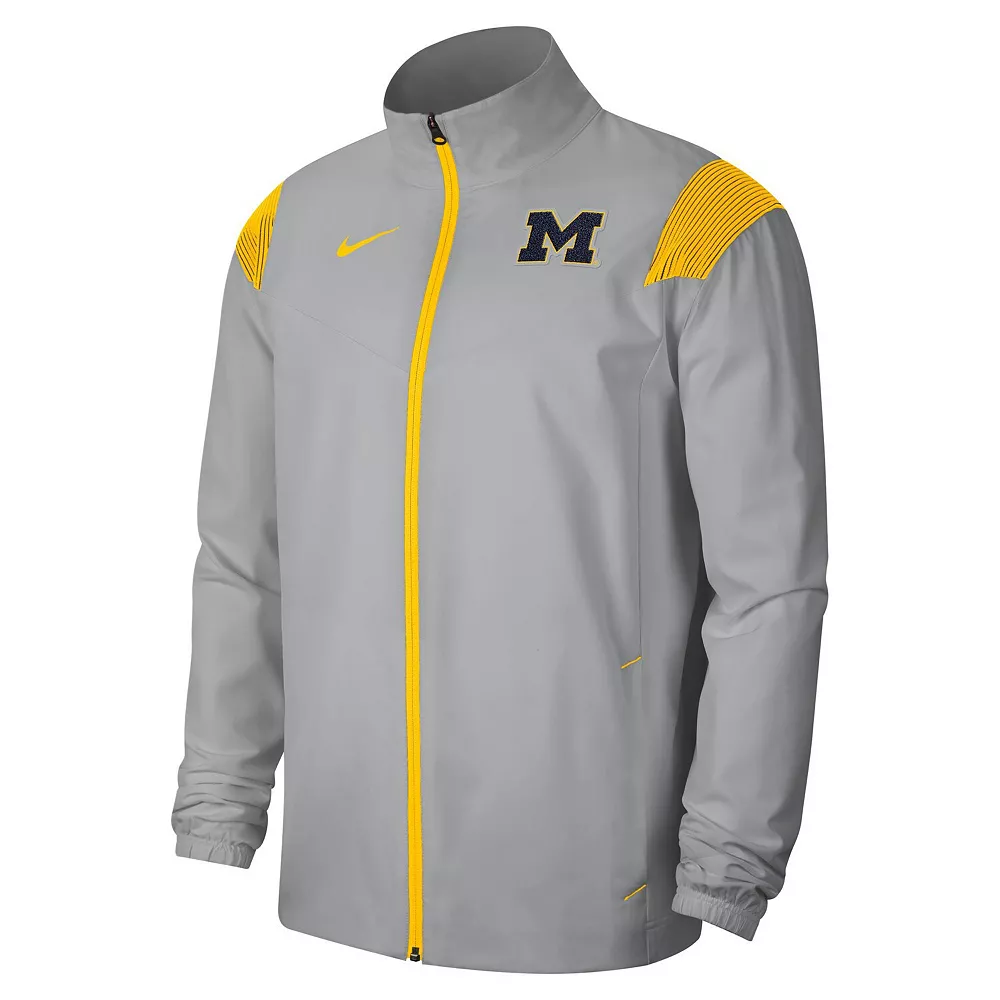 When you’re ready to cheer on the Michigan Wolverines, but there’s a bit of a chill in the air, layer up with this Woven full-zip jacket from Nike. The bold Michigan Wolverines logo on the left chest and the contrasting stripes on the shoulders put your fandom at the forefront. The Olympic collar helps protect your neck from the cold and the elements.